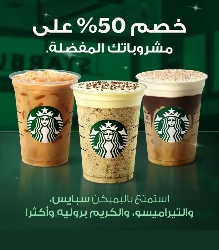 - العرض ساري على مشروب ستاربكس ريفرشا® كركديه التوت مثلج، مشروب ستاربكس ريفرشا® مانجو دراجون فروت مثلج، مشروب ستاربكس ريفرشا® ستروبري آساي مثلج، تيراميسو لاتيه، تيراميسو أمريكانو مثلج، تيراميسو لاتيه مثلج، تيراميسو فرابتشينو، كريم بروليه فرابتشينو® سكر بني، كريم بروليه كولد بروو، كريم برولية امريكانو مثلج، شاي مثلج بالتفاح والخوخ مع الكريمة، بمبكن سبايس لاتيه، بمبكن سبايس لاتيه مثلج، بمبكن سبايس فرابتشينو، تيراميسو ماتشا لاتيه مثلج، بمبكن سبايس ماتشا لاتيه مثلج