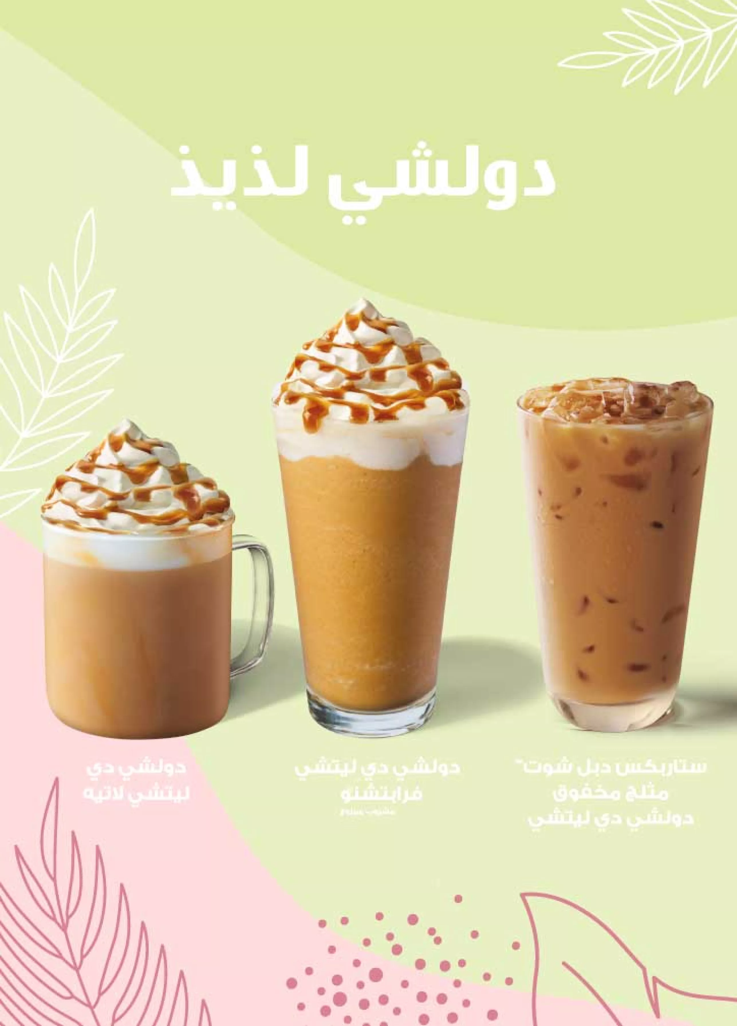 نعرف أنه يصعب على الكثير منا الحصول على اللفظ الصحيح لهذا المشروب: دولسي دي ليتشي، أو دولشي دي ليتشي، أو ألفاظ مختلفة قد تكون سمعت بها! لدى ستاربكس، الجميع يشعر بالسعادة لتسميته #DDL مشروب لذيذ محضر من حليب طازج مبخر ممزوج مع اسبرسو خاص بنا وصلصة دولشي دي ليتشي سلسة، تعلوه كريمة مخفوقة وكاراميل. مثالي لتستبدله بالقهوة المعتادة لكل يوم؟ دلل نفسك واستمتع به ساخناً أو بارداً. لتجربة تذوق مميزة يمكنك أن تختار فرابتشينو دولشي دي ليتشي، ولمحبي الدبل شوت يمكنهم أن يختاروا دولشي دي ليتشي دبل شوت ( مشروبان في مشروب واحد)