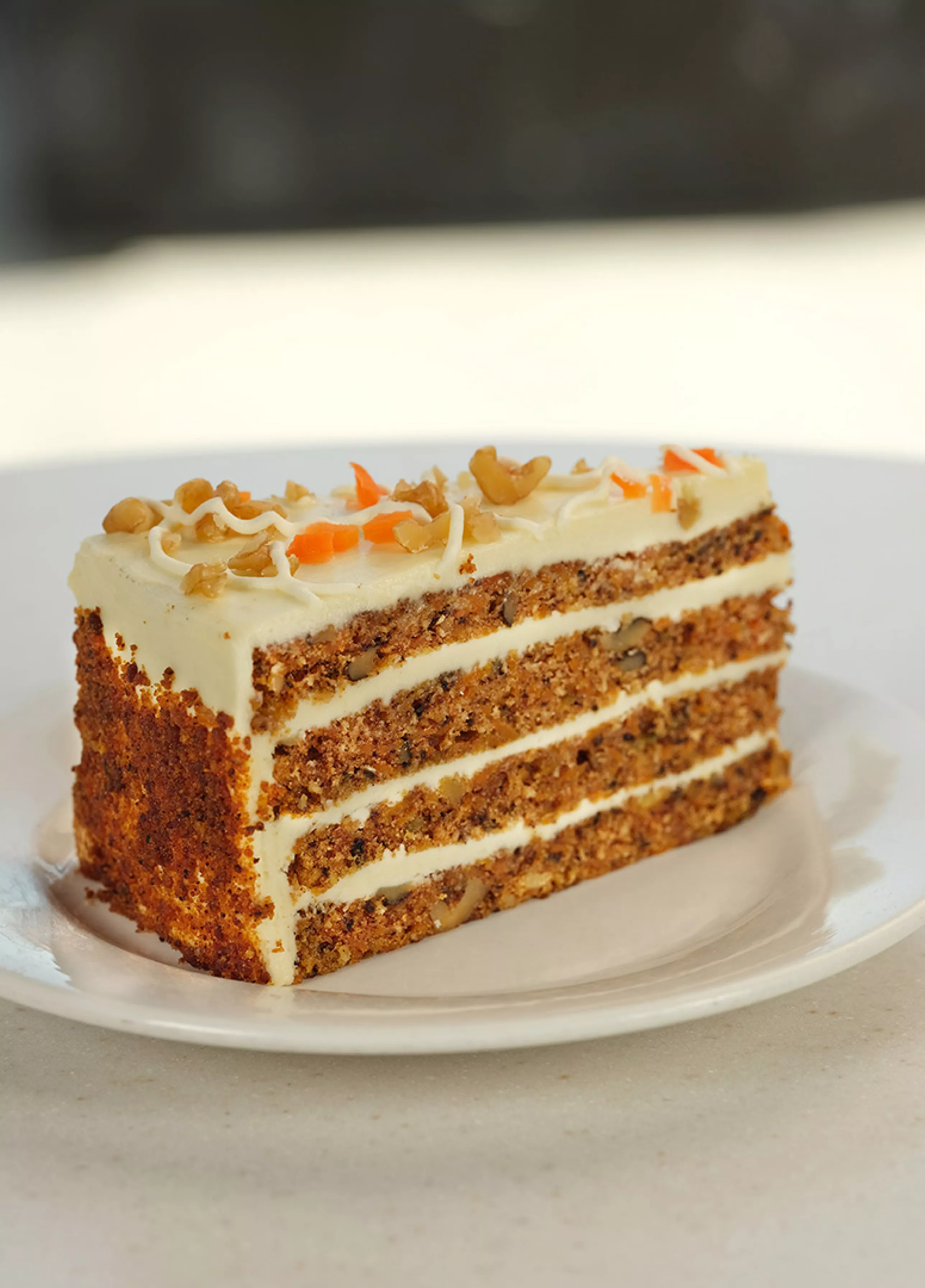 Our ever-popular cake - with layers of walnut and carrot bits laid on a smooth cream cheese icing - finished with a drizzle of white chocolate.